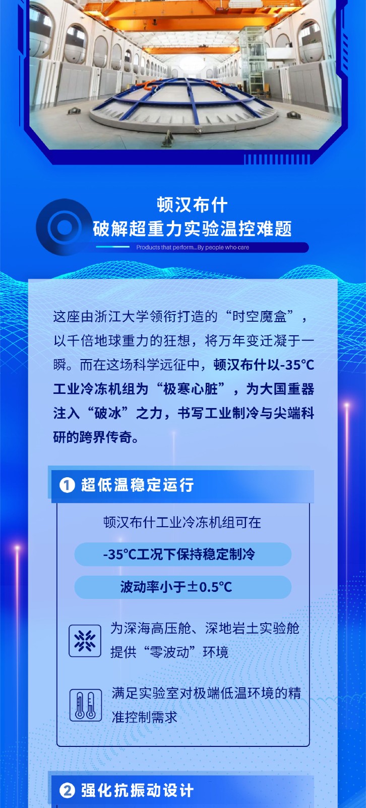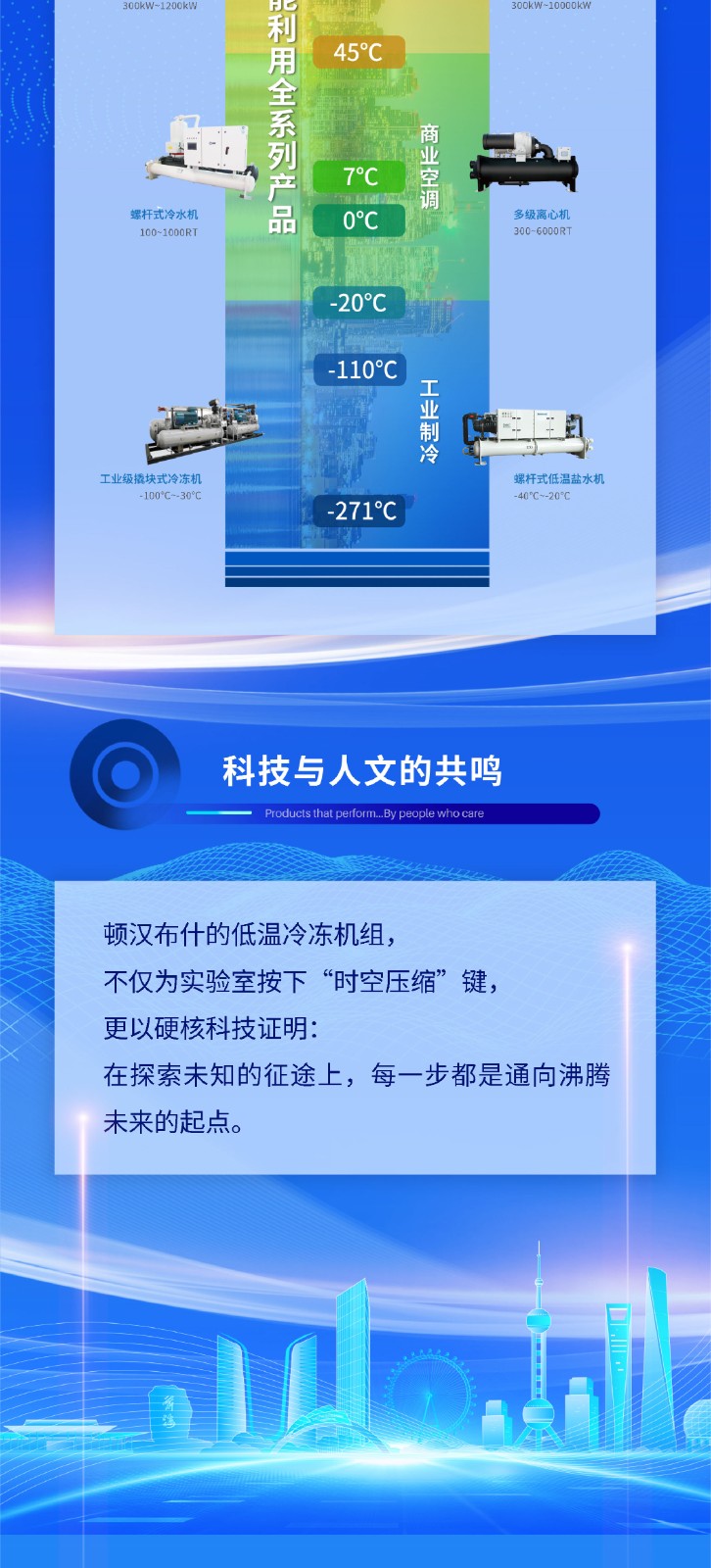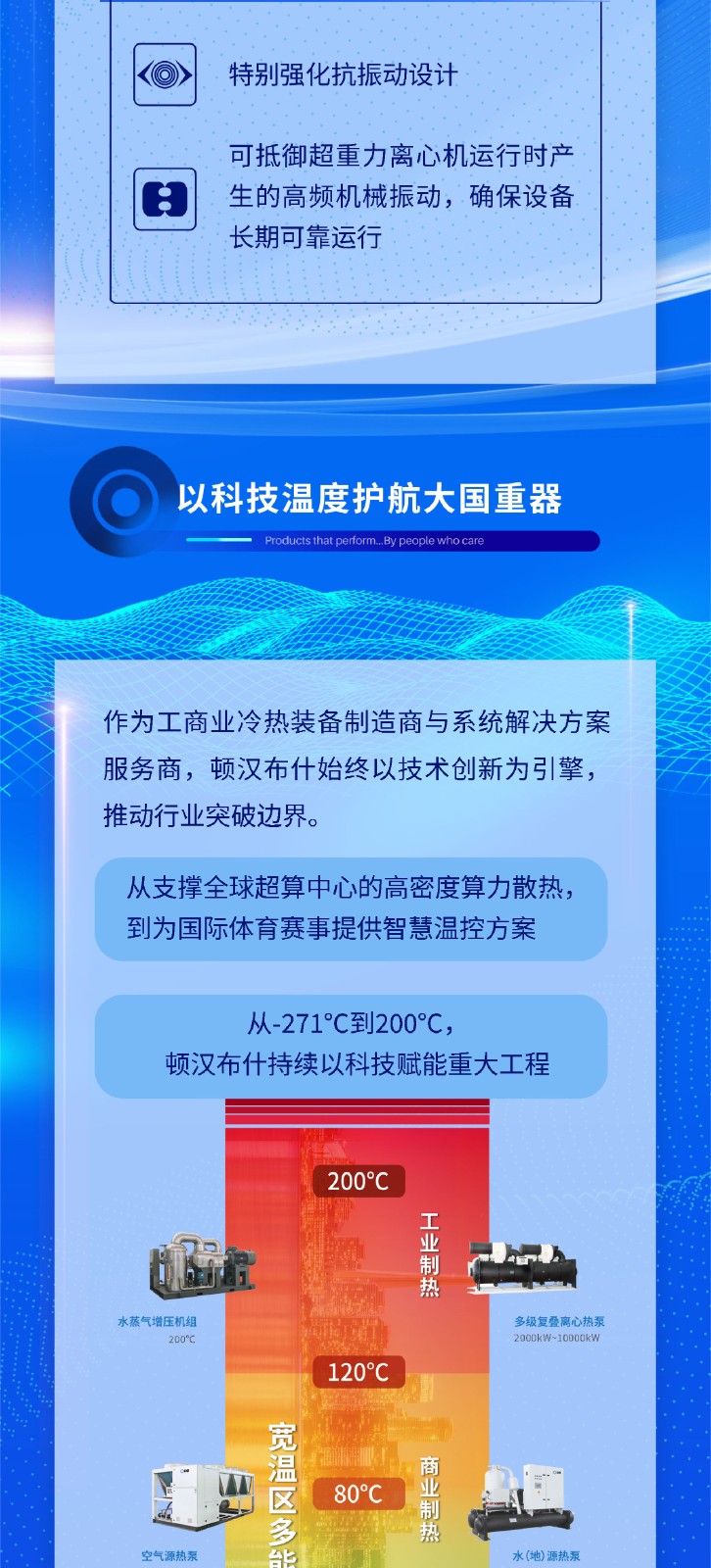 1995年,頓漢布什中國在煙臺設立研發中心和制造工廠,產品線包含壓縮機、大型冷水、熱泵機組、空氣側換熱產品、小型商用空調機組、低溫冷凍機組、冷卻塔等。