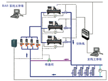 空調水一次泵變流量系統通過改變輸送管網內的冷水流量來滿足用戶負荷需求,有效降低系統消耗能耗,節能效果顯著。一定范圍內減小水流量,增大溫差,對制冷機組能耗影響微??;避免大部分無謂的旁通水流量,并能夠維持較低的系統壓力,從而大幅降低冷凍水泵的功耗,降低運行成本。