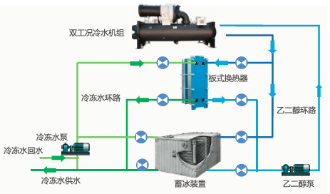 蓄冰系統是將冷量以顯熱、潛熱的形式蓄存在某種介質中,并能夠在需要時釋放出冷量的空調系統。該系統轉移部分日間用電消耗至夜間,通過峰谷電價差政策大幅降低系統運行費用。低溫送風能夠保證空調區域內合適的相對濕度,保證較高的舒適度與空氣品質。