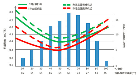 頓漢布什提供一次泵變流量設計方案,以WCFX50TR機組 為例,西安地區每年運行時間超過2400小時,按照國標的 NPLV的計算原則,主機的功率僅僅增加了10,381kW,而水泵的功率減少了40,338kW,每臺機組每年可以減少約29,957 元運行成本。